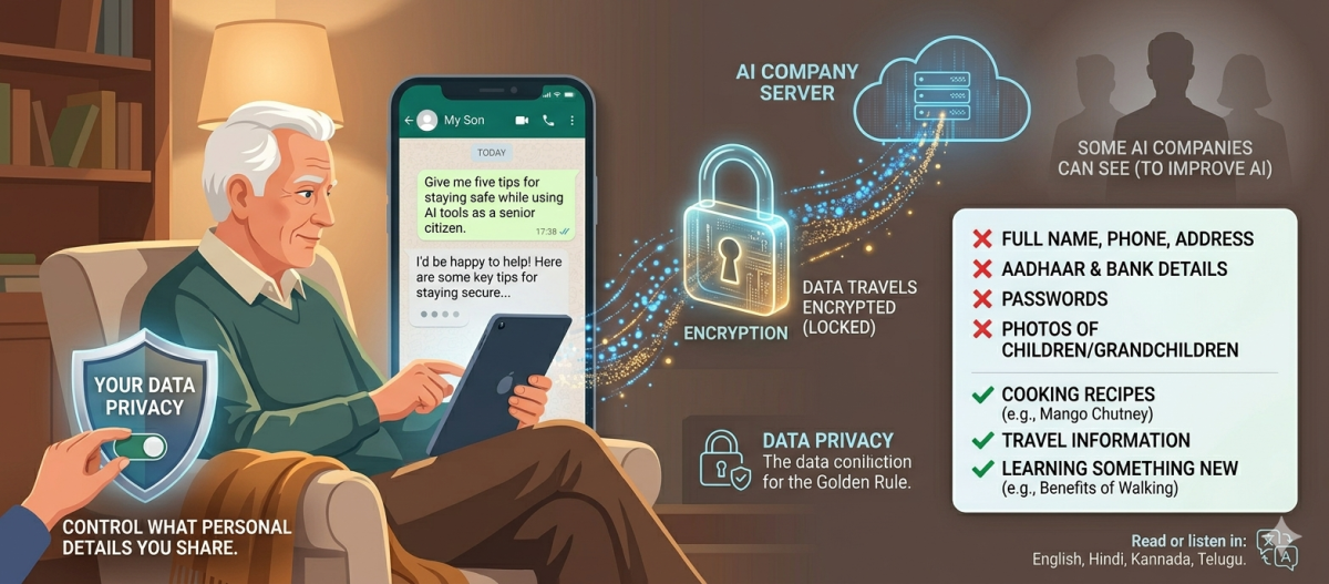 This does not mean AI is dangerous to use. It simply means you should be thoughtful about what you share. A good rule to follow is this: do not type into an AI anything you would not want a stranger to read. Avoid sharing your full name, phone number, home address, Aadhaar number, bank details, passwords, or photos of your children and grandchildren. For general questions about cooking, travel, health information, or learning something new, AI is perfectly safe and helpful to use.